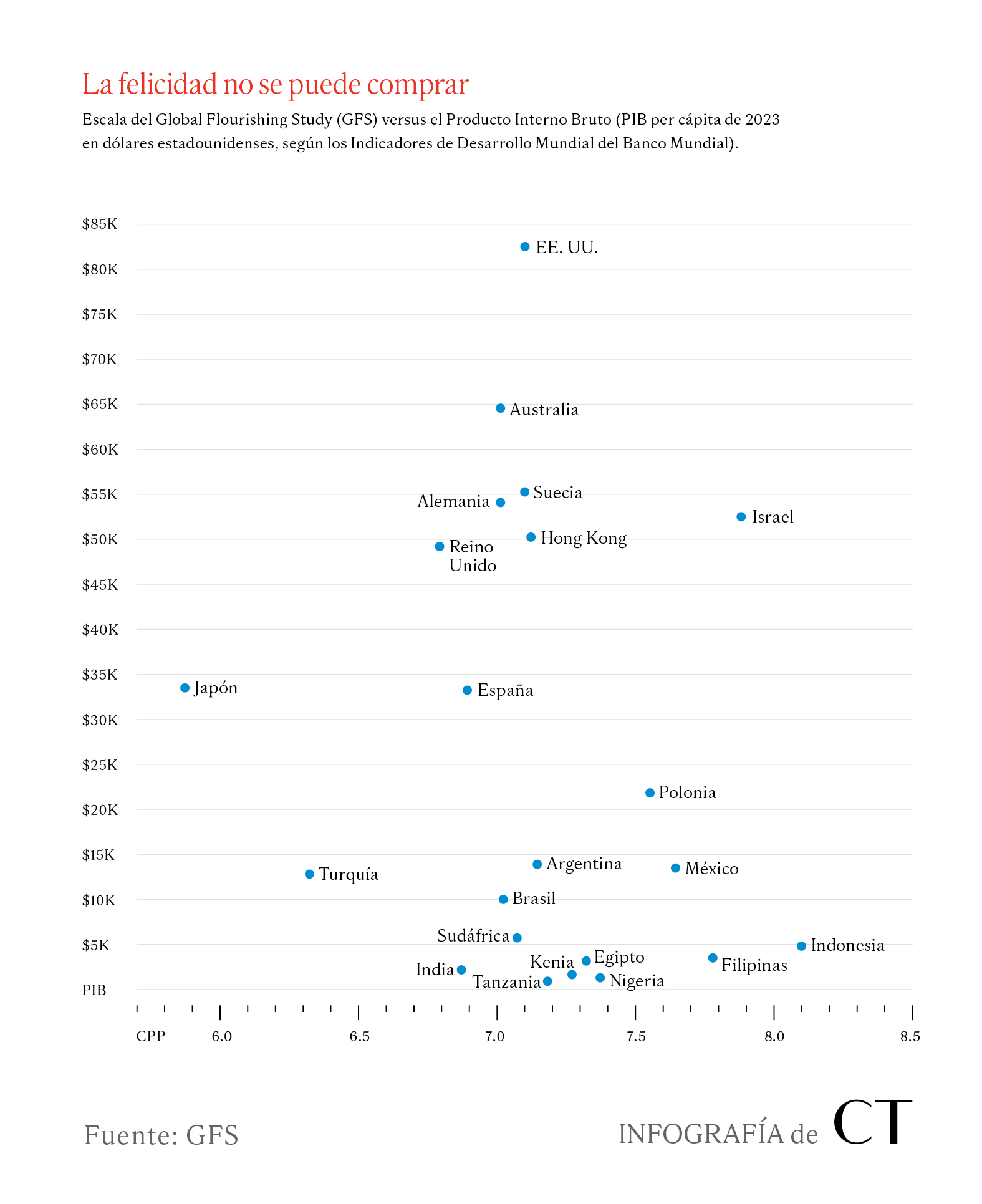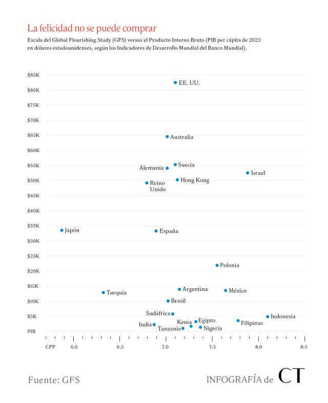 Por ejemplo, incluso después de tener en cuenta la seguridad financiera autoevaluada, países de ingresos medios y bajos como Indonesia, México, Kenia y Tanzania (este último con un PIB per cápita en 2023 de 1211 dólares) tienen puntuaciones medias de plenitud compuesta más altas que países ricos como Estados Unidos, Suecia, Alemania y Japón. Los habitantes de Tanzania, uno de los países más pobres del mundo, declaran tener una mayor sensación de plenitud general que los suecos, que son ricos y viven en un país estable.